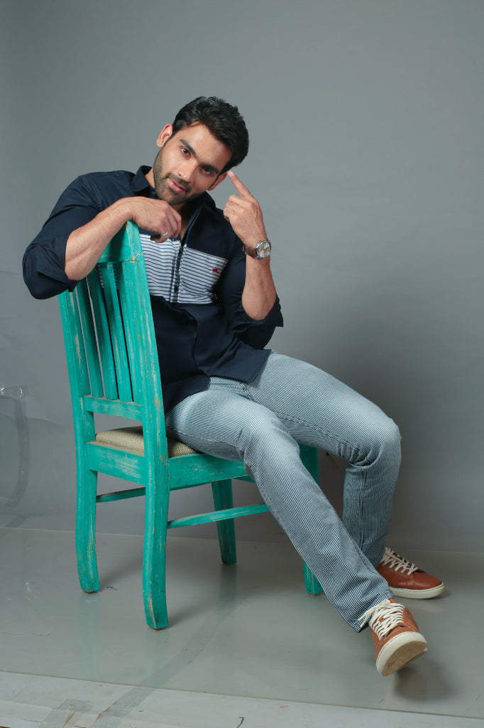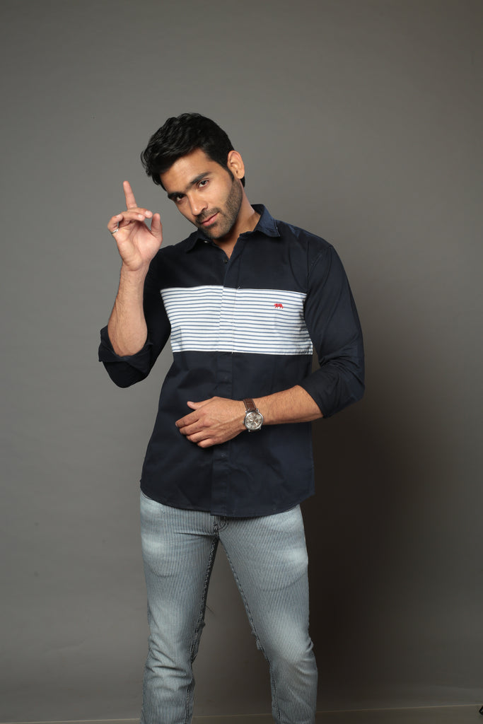 Navy Blue & Blue lines Slim Fit Casual Shirt, has a spread collar, long sleeves, button placket, and curved hem