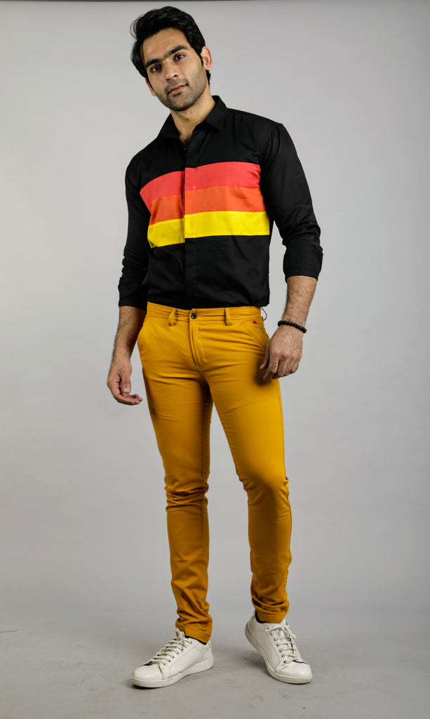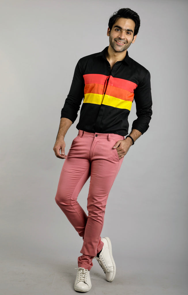 Black with multicolored Slim Fit Casual Shirt, has a spread collar, long sleeves, button placket, and curved hem