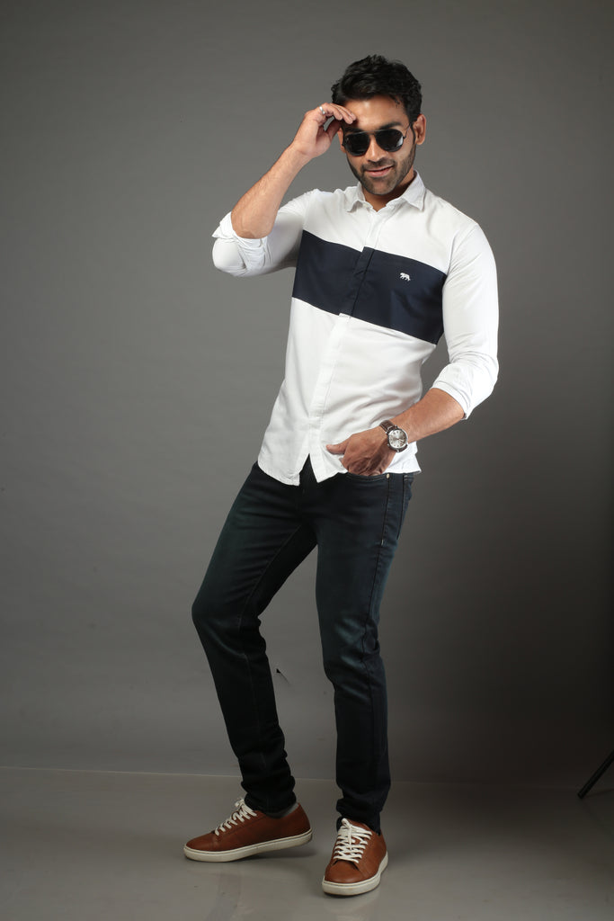 White & Black Color Block Slim Fit Casual Shirt