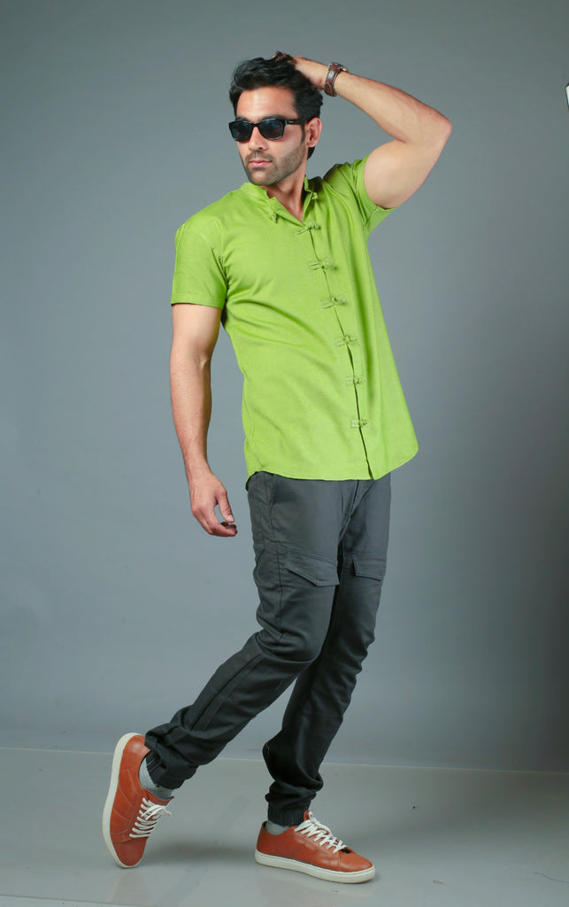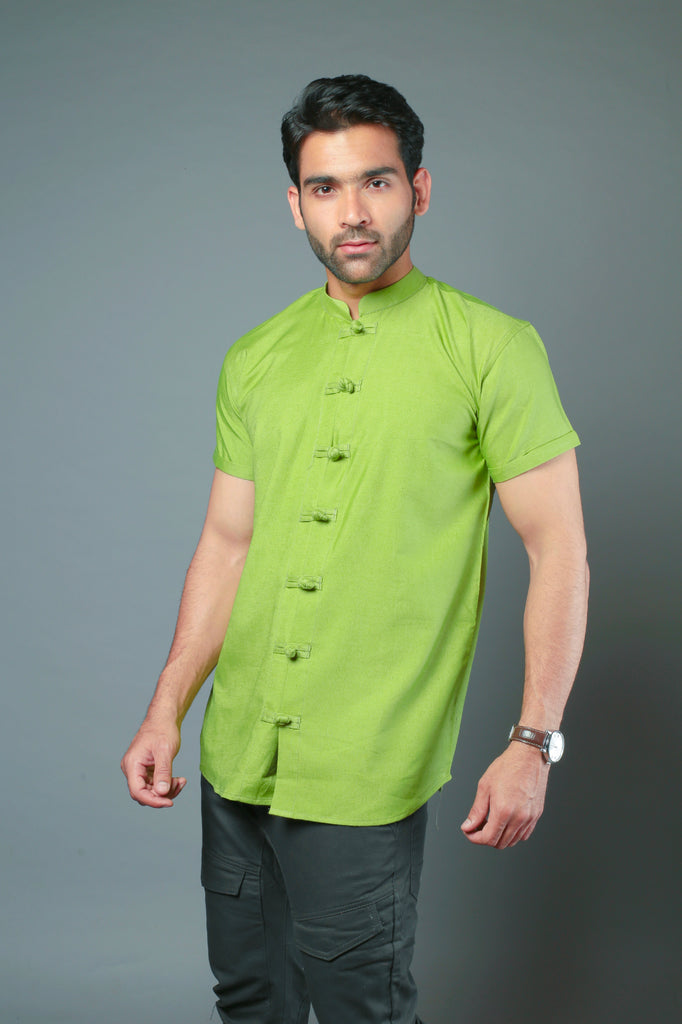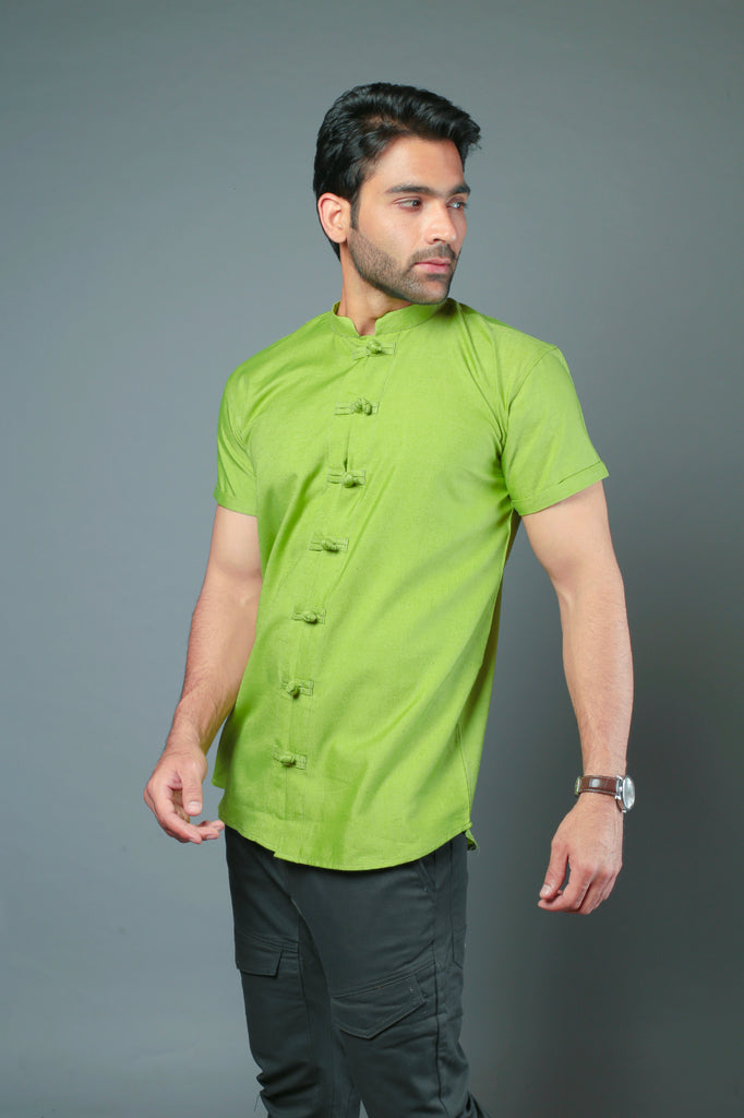 Men C-Style Green Color Slim Fit Casual Shirt, has a mandarin collar, long sleeves, curved hem, one patch pocket