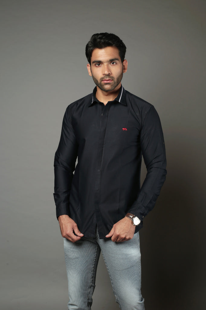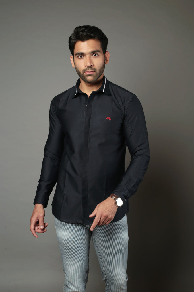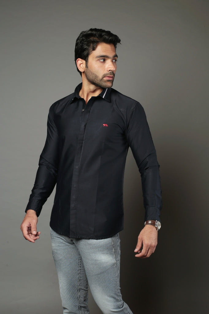 Men Solid Navy Blue Color With Collar Strip Slim Fit Casual Shirt