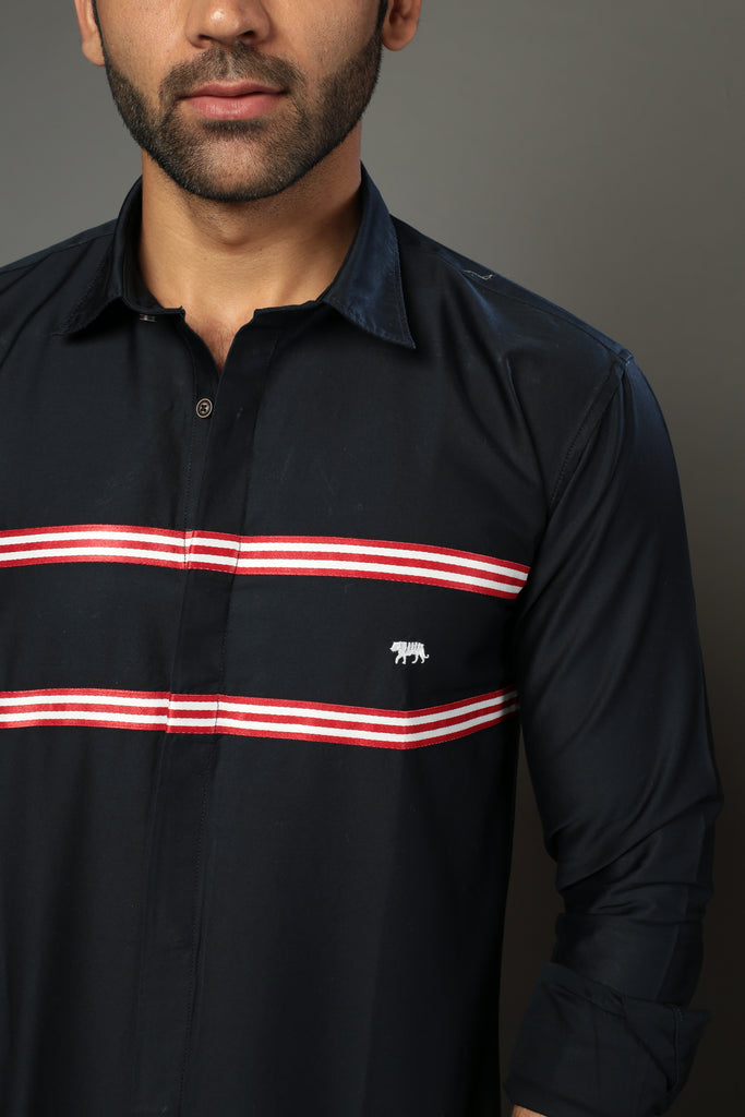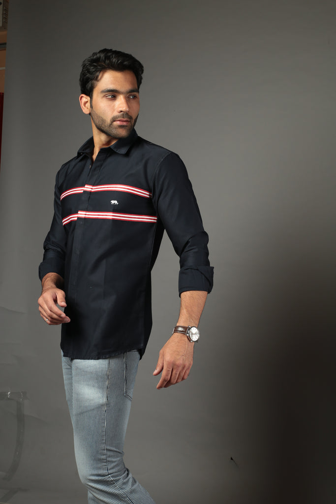 Men Solid Navy Blue Color With Cross Strip Slim Fit Casual Shirt