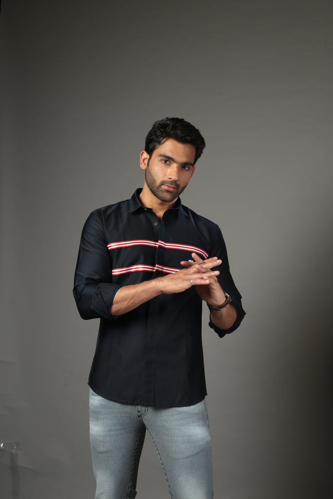 Men Solid Navy Blue Color With Cross Strip Slim Fit Casual Shirt, has a spread collar, long sleeves, button placket, and curved hem
