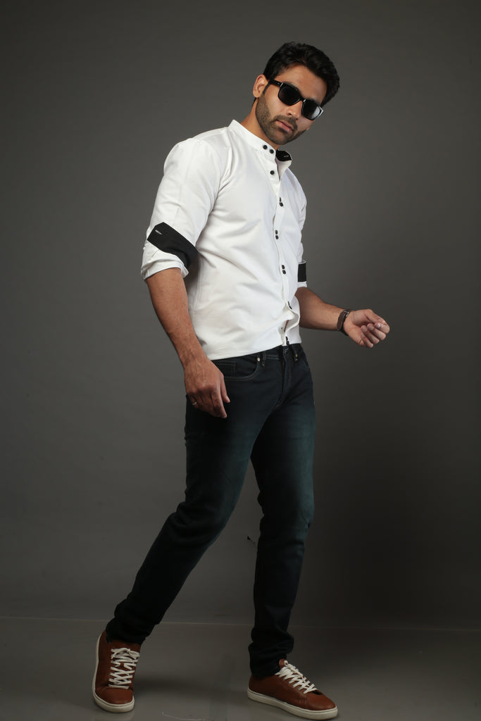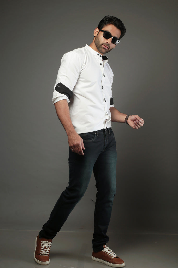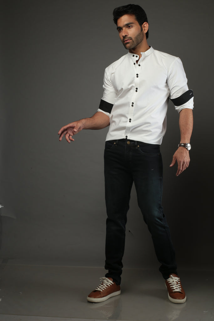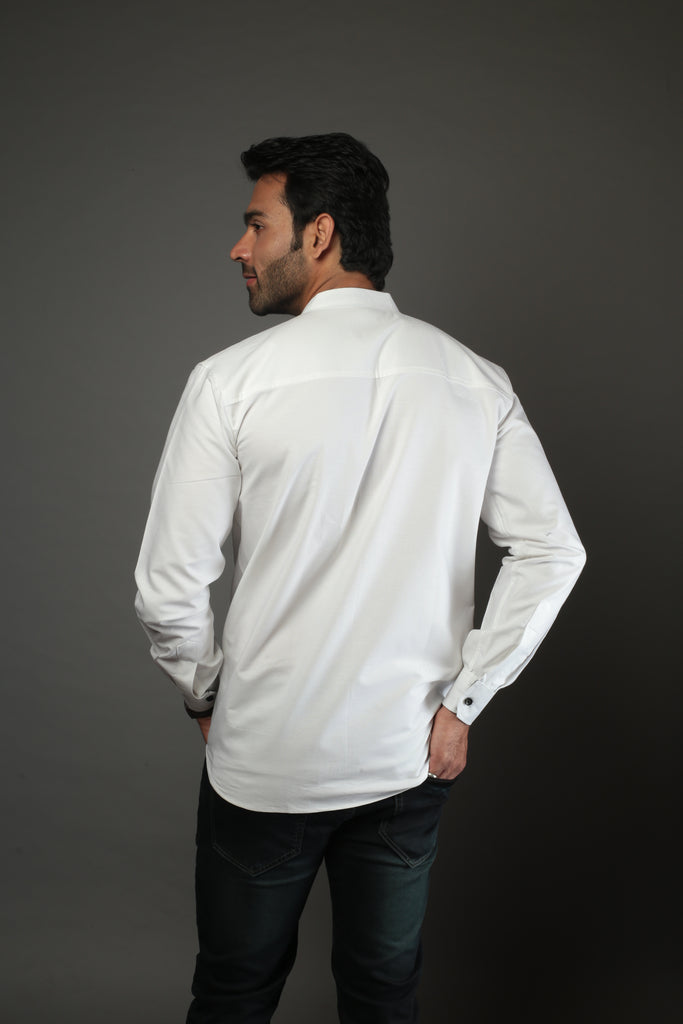Men Solid white color with double button Slim Fit Casual Shirt, has a mandarin collar, long sleeves, curved hem, one patch pocket