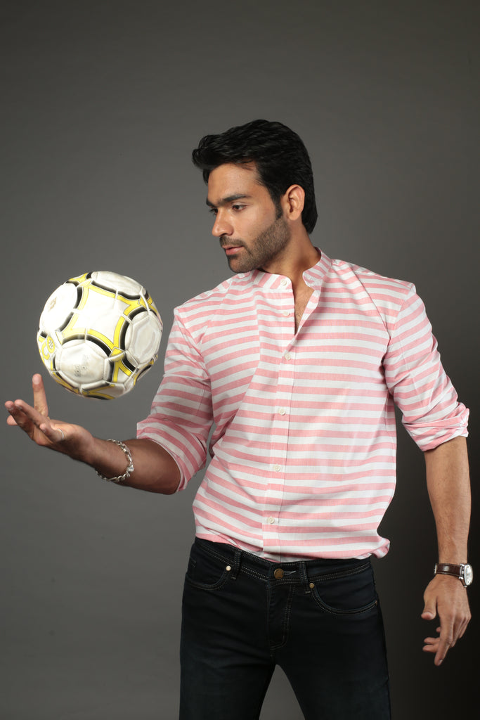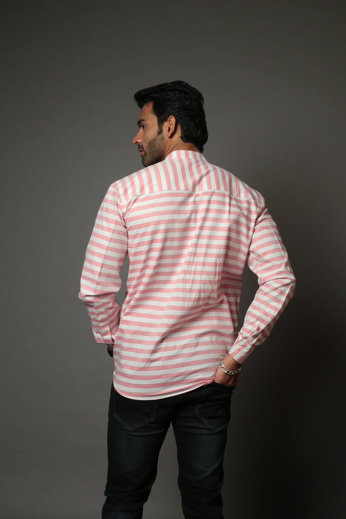 Men Stripes Slim Fit Casual Shirt, has a mandarin collar, long sleeves, curved hem, one patch pocket