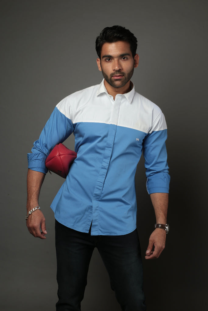 Sky Blue & White Color blocked Slim Fit Casual Shirt