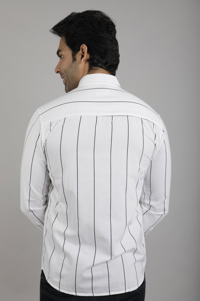 White & Black lines Slim Fit Casual Shirt, has a spread collar, long sleeves, button placket, and curved hem
